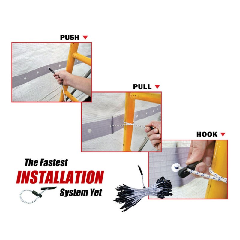 Scaf-Lite Scaffold Sheeting is a premium grade string reinforced poly sheeting manufactured with innovative reinforced eyelet bands. The reinforced eyelet bands are laminated onto the sheeting and provide a quick, safe and secure method of installation by fastening the sheeting to scaffolding. Scaf-Lite Sheeting is designed to be installed with specialty bungee ties using the _Push, Pull, Hook" method. You simply push the pointed tip of the bungee tie through the eyelet holes staggered along the eyelet bands, You then pull the cord back towards the scaffold and the tie around the nearest scaffold structure To fasten, you simply use the toggle end wrap it ties back to the elastic cord. The process is very quick and efficient during installation. Scaf-Lite Sheeting is proven to save TIME, LABOR and ENERGY during installation.