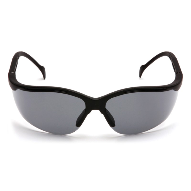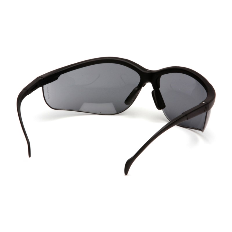 Pyramex Safety - Venture II - Black Frame/Gray Lens - 9.75 Base curved lens provides full side protection without distracting seams or traditional type side shields. Nose buds secure the glass and prevent slipping while providing a pillow soft fit. Fully adjustable temples - 4 size settings. Lenses provide 99% protection against harmful UV rays. Lenses are coated for superior scratch resistance.