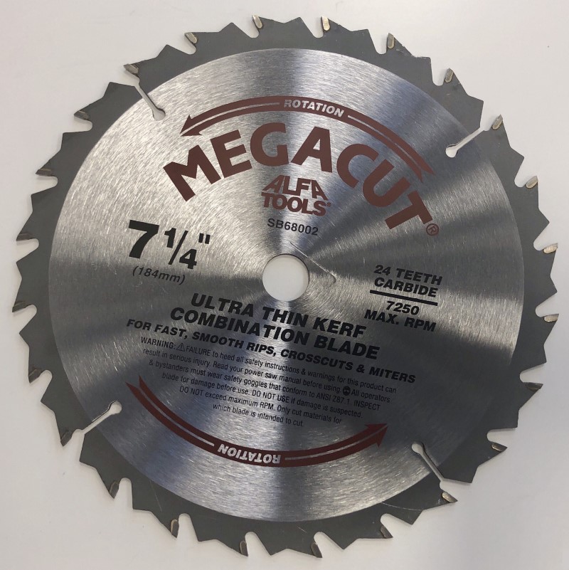 Circular Saw Blade, Alfa Tools, 24 Tooth, 7 1/4,". Circular Saw Blade, Nail Cutting Blade, Carbide Tipped, Framing, 7-1/4" Blade Diameter, 14 Teeth, 5/8" Universal Arbor, .120" Kerf, 9400 RPM, 1 per clamshell pkg