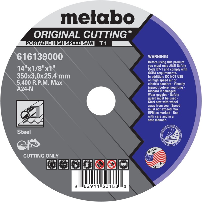 Cutting Wheel, Metabo, 616139000, 14"x 1/8" with 1" Arbor, 10 Blades per Box, Price per 10 Boxes