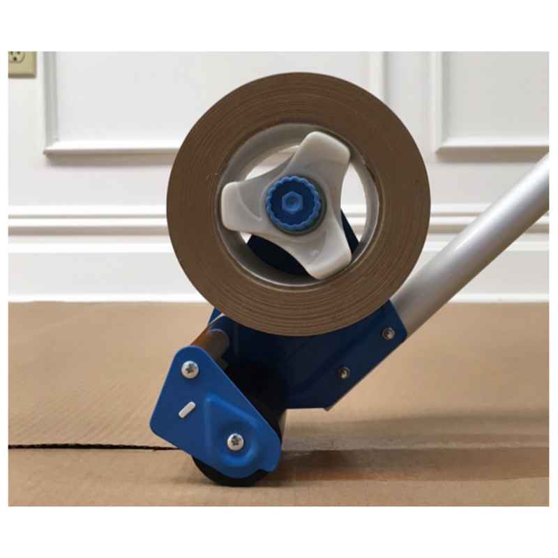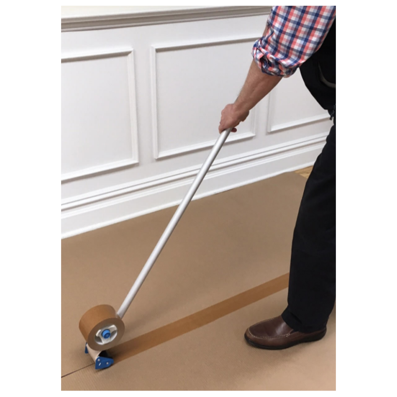 Floor Board Tape Dispenser. For use with all 2" to 6 1/2" tapes. Hand held applicator for Floor Board Seaming Tape. Makes the job of seaming Floor Protection Board easy and quick. Works with all grades of tape; Floor Board Tape, Masking Tape, Poly Tape, Aisle Marking Tape and many different types of flooring protection, Floor Board, Cardboard Sheets, Masonite, Kraft Paper, poly sheeting and more.