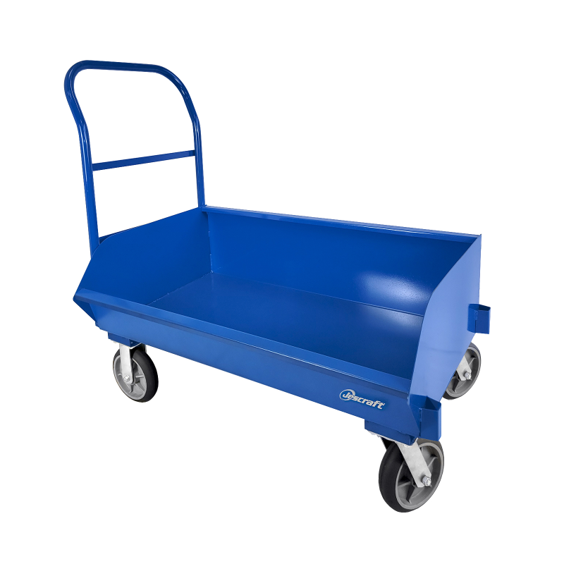 The Low-profile Chip Cart with Side Scoop is designed to capture or contain loose or scrap materials, such as parts, metal shavings, or wood chips.