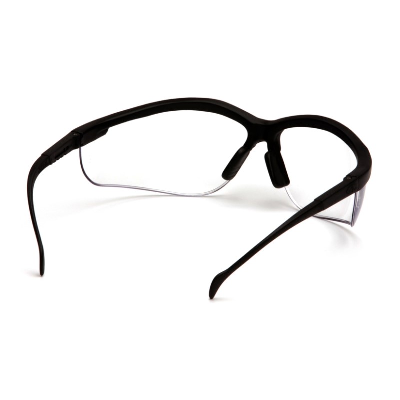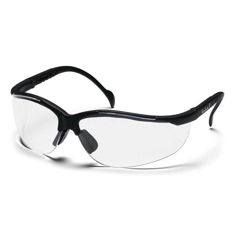 Pyramex Safety - Venture II - Black Frame/Clear Lens - 9.75 Base curved lens provides full side protection without distracting seams or traditional type side shields. Nose buds secure the glass and prevent slipping while providing a pillow soft fit. Fully adjustable temples - 4 size settings. Lenses provide 99% protection against harmful UV rays. Lenses are coated for superior scratch resistance.