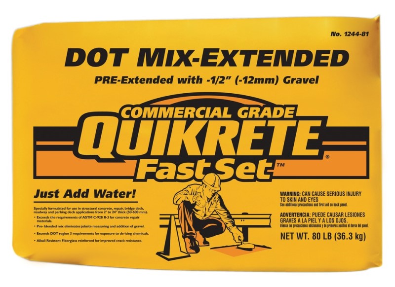 QUIKRETE Commercial Grade FastSetTM DOT Mix is a fiber reinforced, rapid-setting repair material specifically designed to meet ASTM C928 Category R3 specifications for high-performance repair material. This 80lb bag comes pre-extended with 1/2" pea gravel.