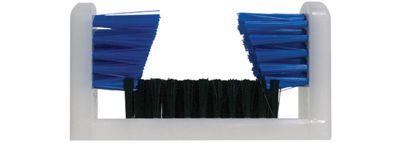 Three pieces solid injection molding with Black Polypropylene bristles in the base and Blue Polypropylene bristles in the sides. Tapered side bristles allow for easy removal of wet and dry debris from shoes and boots. Two predrilled holes with screws allow for easy attachment to most wooden surfaces.