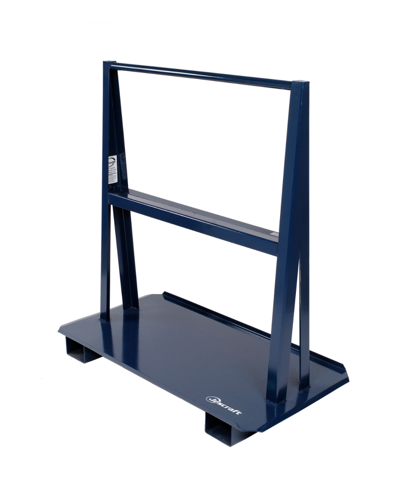 The WA-4824F "A" Frame Cart - Forklift Attachment is perfect for transporting drywall sheets, plywood, panels and steel. This cart is constructed of a 12 gauge steel deck ensuring strength and durability. Efficient double-sided "A" frame rack allows material to be loaded on both sides. With 8" of deck space on each side, this cart maximizes cargo space with a total of 16" of deck space. The forklift pockets allow for secure forklift transport of load.
